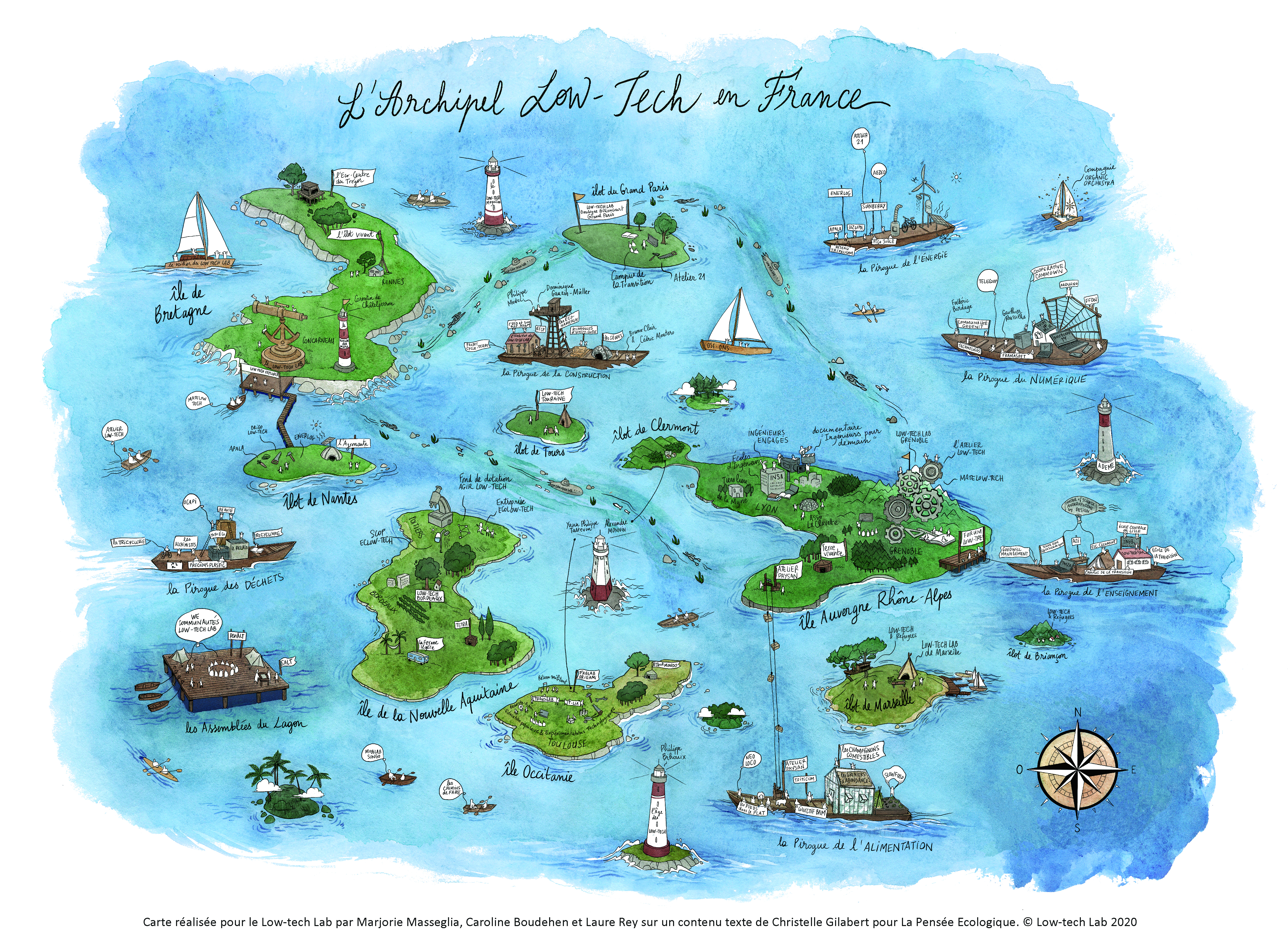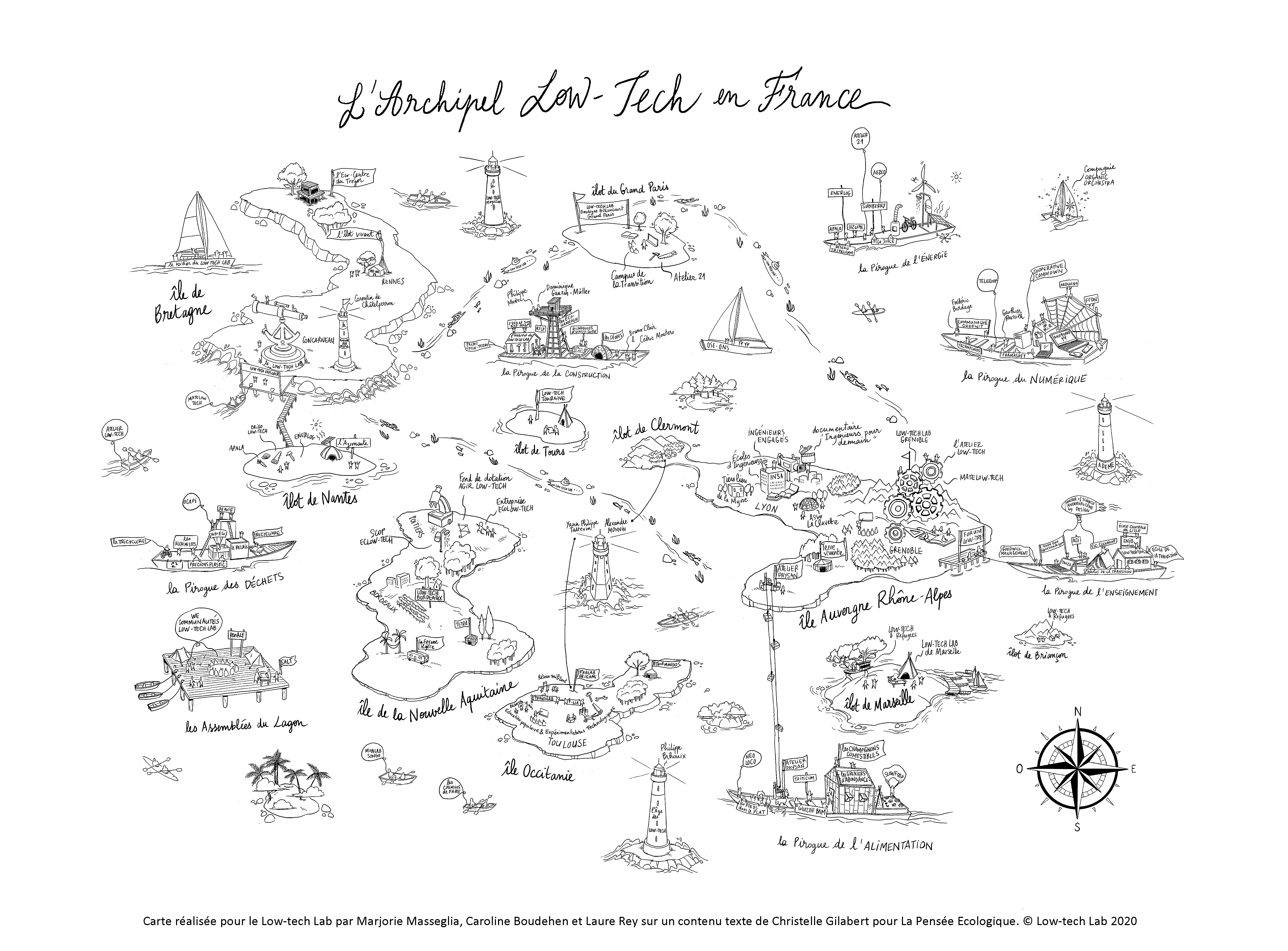 Christelle Gilabert est journaliste indépendante spécialisée dans les problématiques de technologie, de climat et d’environnement. A la croisée de ces chemins, on trouve la low-tech à laquelle Christelle s’est intéressée pour Usbek & Rica ou La Pensée Écologique. Pour ce dernier, elle a travaillé sur un “essai cartographique” de la low-tech en France. Mieux qu’un inventaire à la Prévert, son article propose une photographie à l’instant T (ici l’été 2020) des acteurs de ce milieu par le biais d’une représentation imagée inspirée du poète et philosophe Édouard Glissant : l’archipel.