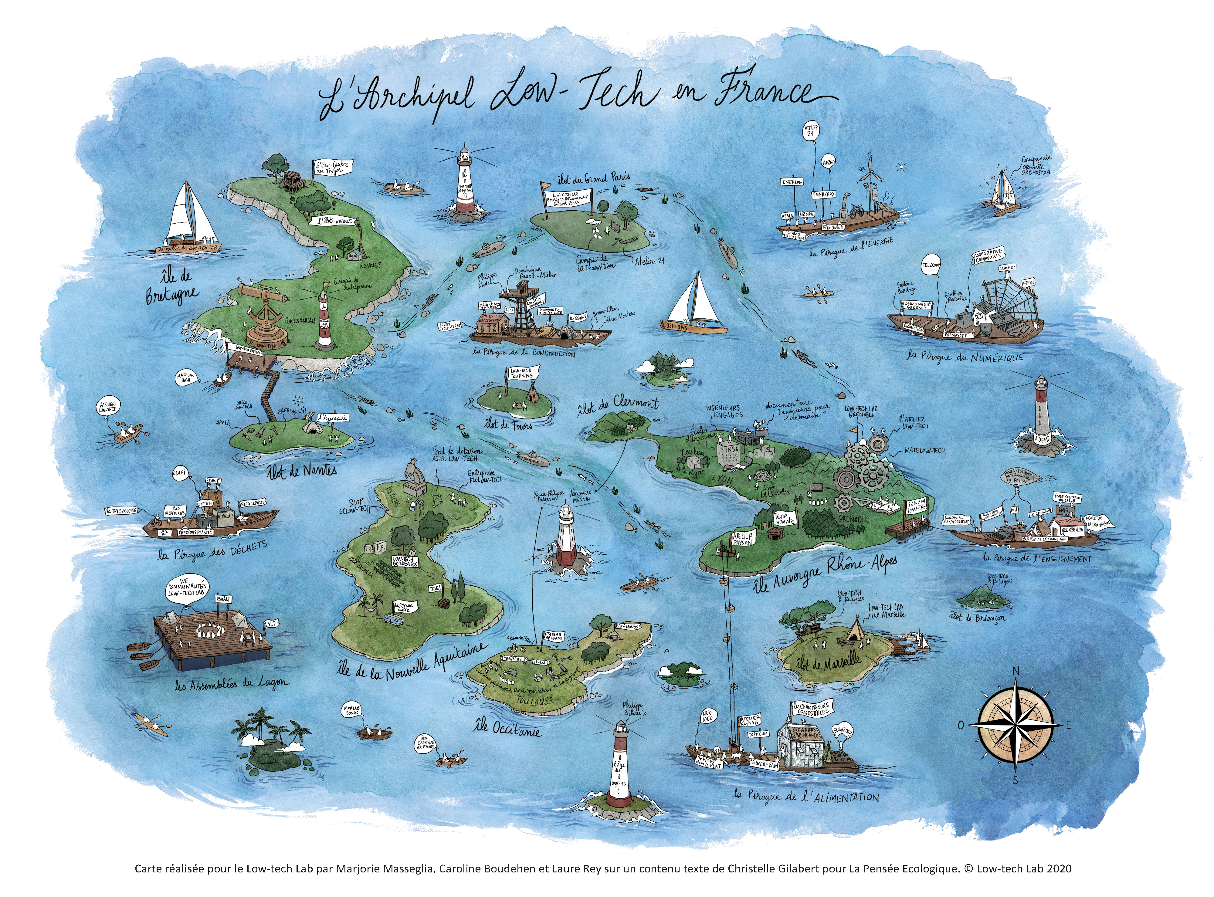 Le Low-tech Lab a souhaité contribuer en proposant une illustration de ce texte, accompagné d’un résumé de l’article par l’auteure en personne. De cet essai qui est à découvrir en entier sur le site cairn.info (contenu payant) et grâce au travail collaboratif de trois graphistes bénévoles - Caroline Boudehen, Laure Rey et Marjorie Masseglia - l’article de Christelle Gilabert prend vie au travers de ce dessin de l’archipel low-tech.